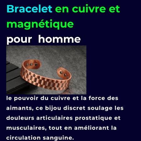 La force du cuivre, la puissance des aimants : Ce bracelet en cuivre pur, travaillé avec soin, est doté d'aimants thérapeutiques. Il combine les bienfaits naturels du cuivre, reconnu pour ses propriétés anti-inflammatoires et antibactériennes, avec la puissance des aimants, réputés pour améliorer la circulation sanguine et soulager les douleurs articulaires et musculaires.